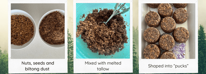 This was a bit of a “wing-it” situation. Rather than drying the meat myself, I sourced a local ingredient: biltong “dust” from our South African butcher. Biltong dust is a dried and powdered form of the spicy, cured meat snack that’s a staple in South Africa. I also added roasted nuts and seeds for extra crunch and minerals (to ward off cramps) and mixed everything with melted tallow, seasoned generously with salt. Then I spooned the mixture into silicone moulds to form individual “pucks.”