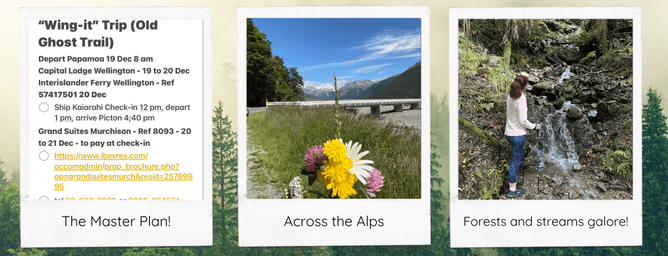 The South Island of New Zealand is an incredible area - vast open plains, snowy capped mountains and the ocean all around. We did get to hike some distance into the first day of the Old Ghost Trail and also from the other end - what would have been day five. Lush forests and beautiful mountain fed streams greeted us as we made our way along the fabulously maintained trail - soothing my disappointed heart with the promise of next time! What I do know for sure, is that all the planning is done - buckets of thanks to my ultra organized hiking companions! (Check out the military precision notes below!) Roll on February 2026 - I am ready for you!!!